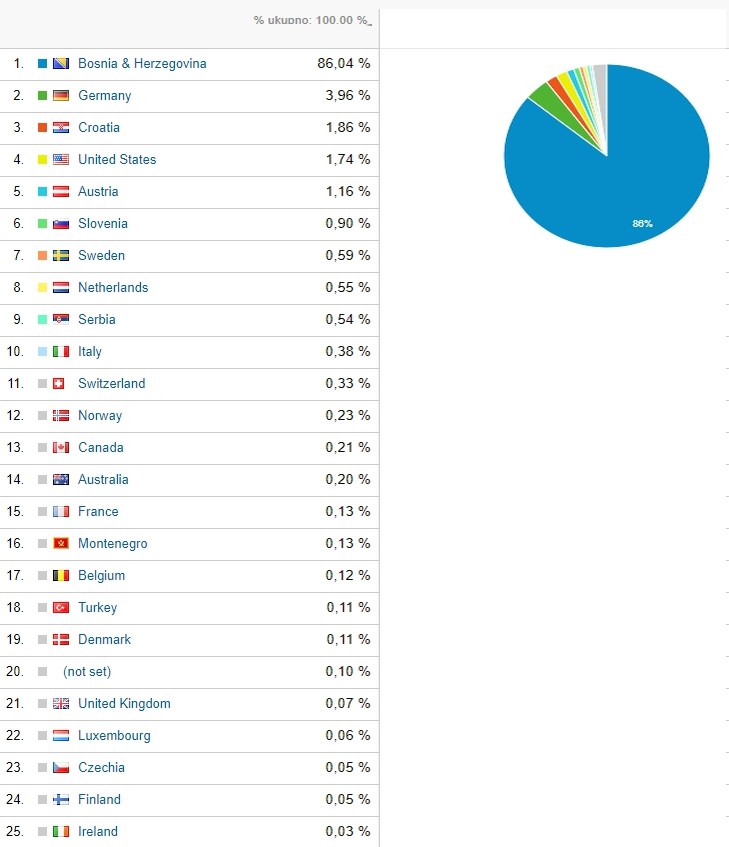 Odakle ste dolazili na sajt? Najviše posjetilaca je, logično, registrovano na uređajima u Zenici, a slijede Sarajevo, Mostar, Zagreb, Beč, Banja Luka, Minhen, Ljubljana, Tuzla, Beograd, Frankfurt, Split, Štutgart, Irvine, Široki Brijeg, Travnik, Hamburg, Keln, Tešanj…