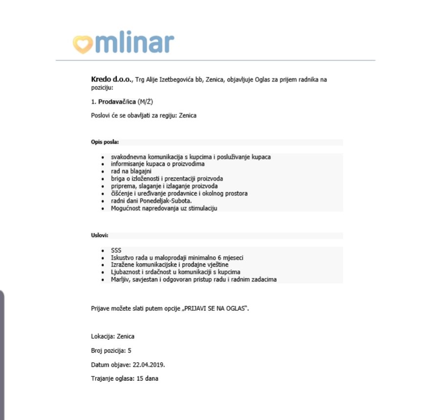 Prijave i sve dodatne informacije vezane za oglas molimo slati na email: [email protected]