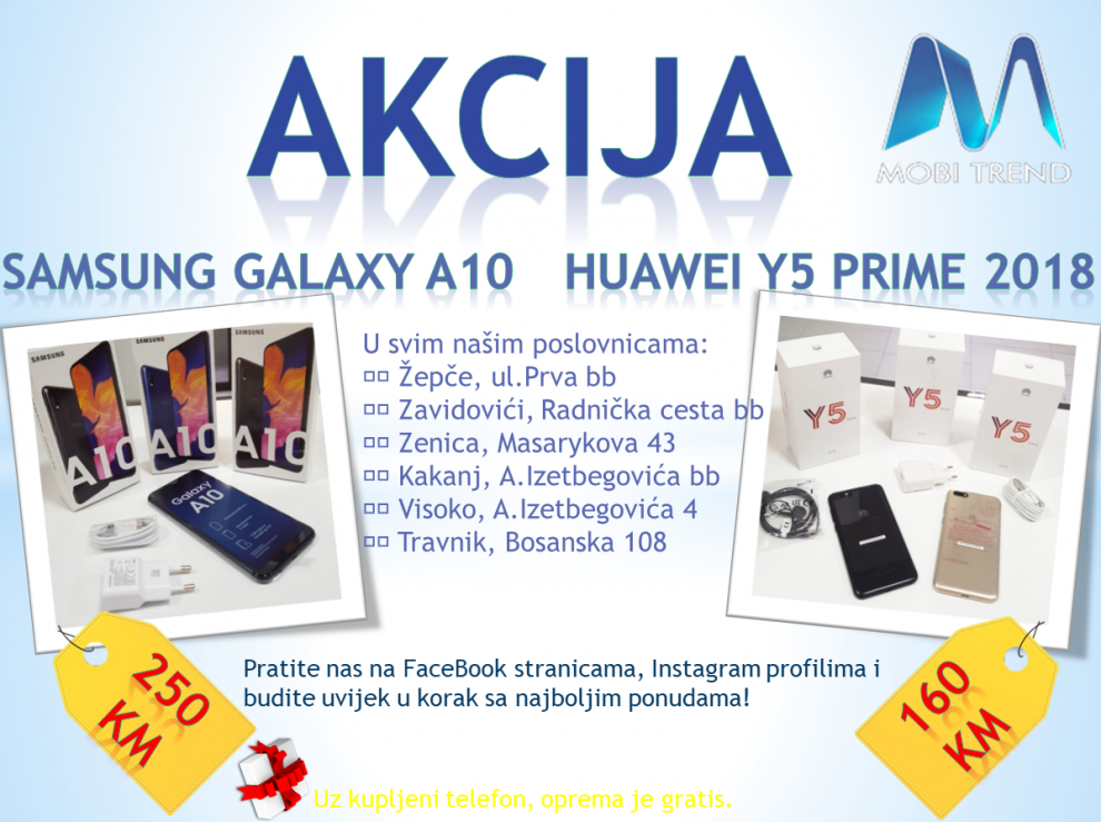 Mobi-Trend: akcija – Poštovani kupci, u toku je velika akcija na mobilne uređaje u svim našim Mobi-Trend poslovnicama. Ovog puta iz ponude izdvajamo Samsung galaxy A10, koji može biti Vaš za 250,00 KM i Huawei Y5 Prime 2018 po nevjerovatnoj cijeni od 160,00 KM.