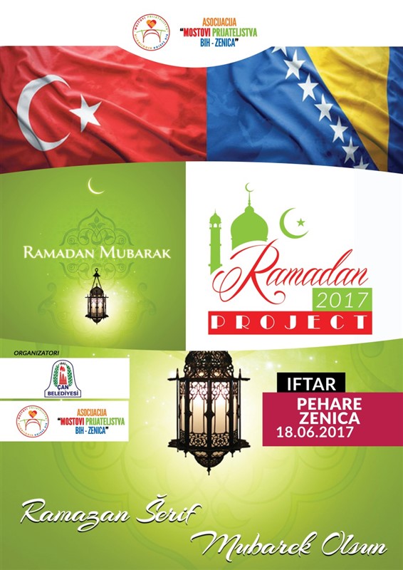 Asocijacija Mostovi Prijateljstva BiH Zenica tokom mjeseca Ramazana realizuje veliki broj iftara širom BiH. Danas(18.06) smo organizovali dva iftara. Jedan iftar u rudniku uglja Breza za 100 postača-rudara i drugi iftar u naselju Pehare u Zenici za 125 postača iz džemata Pehare. Sponzor iftara bila je općina Çan iz Republike Turske na čelu sa načelnikom Abdurahman Kuyuz.