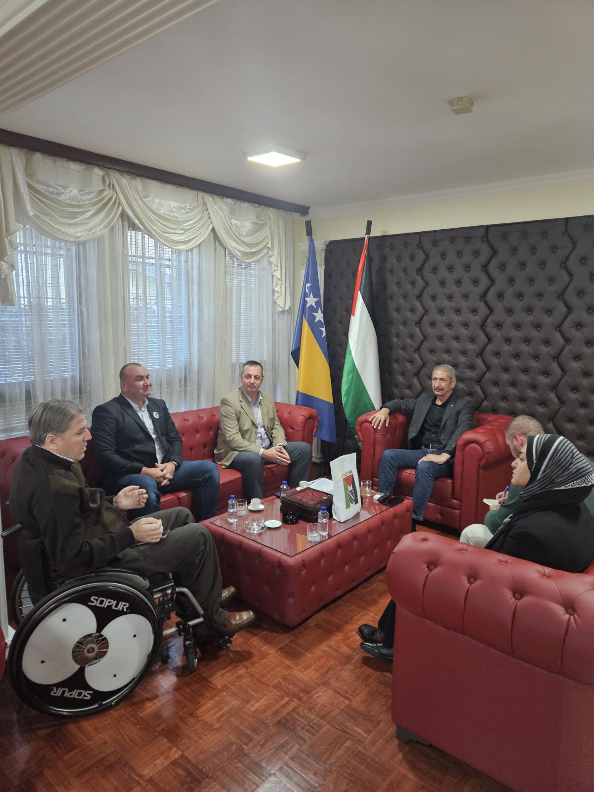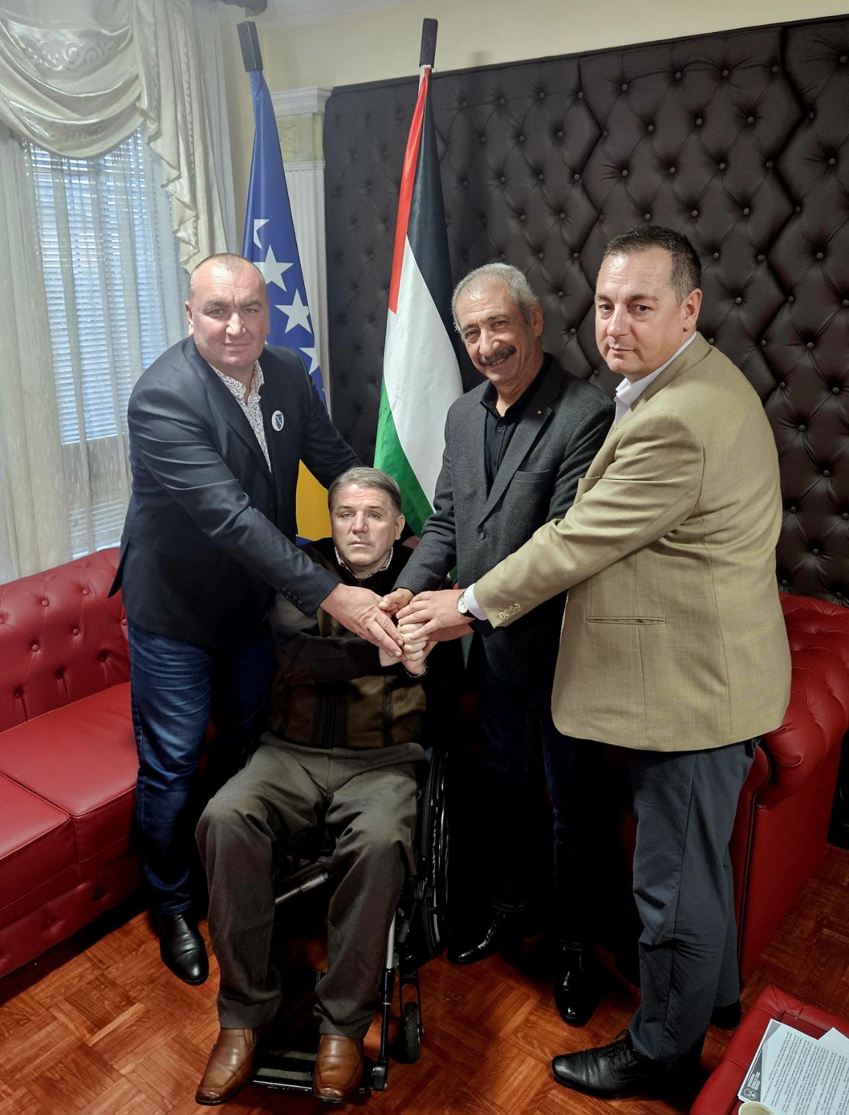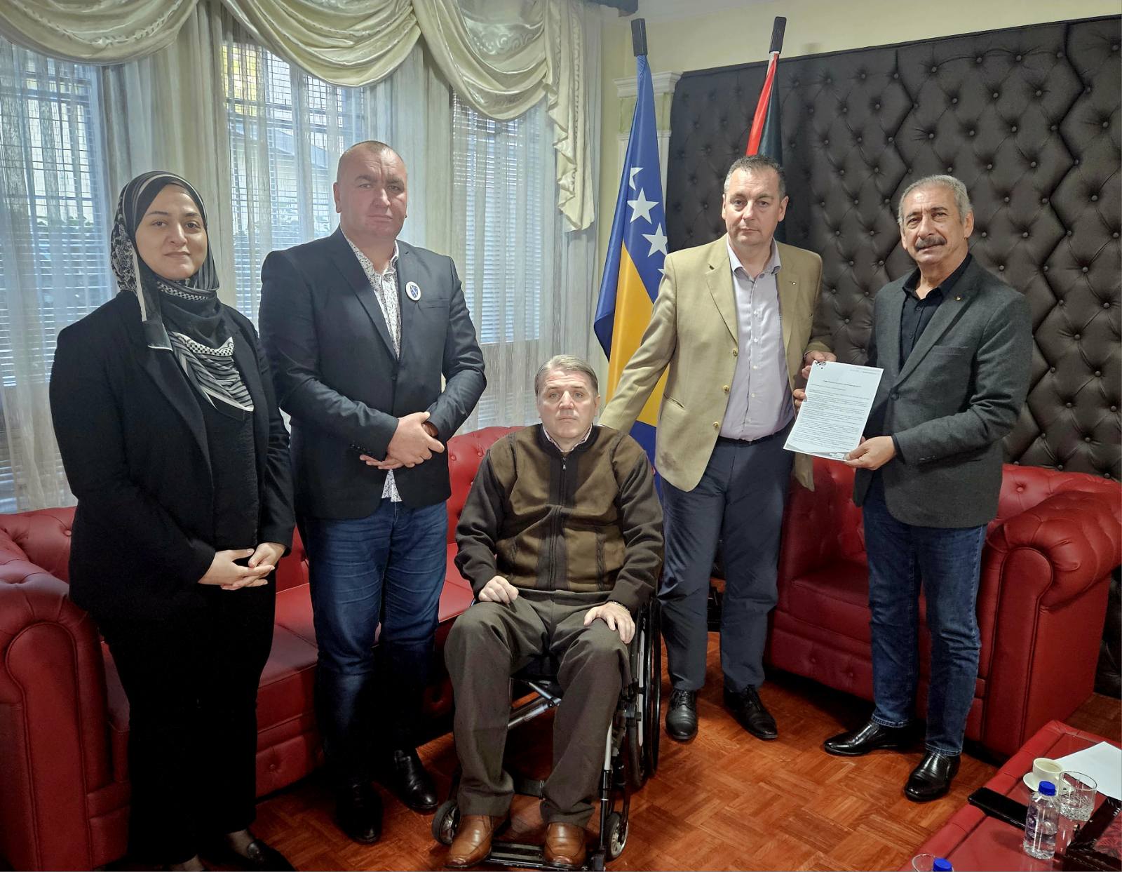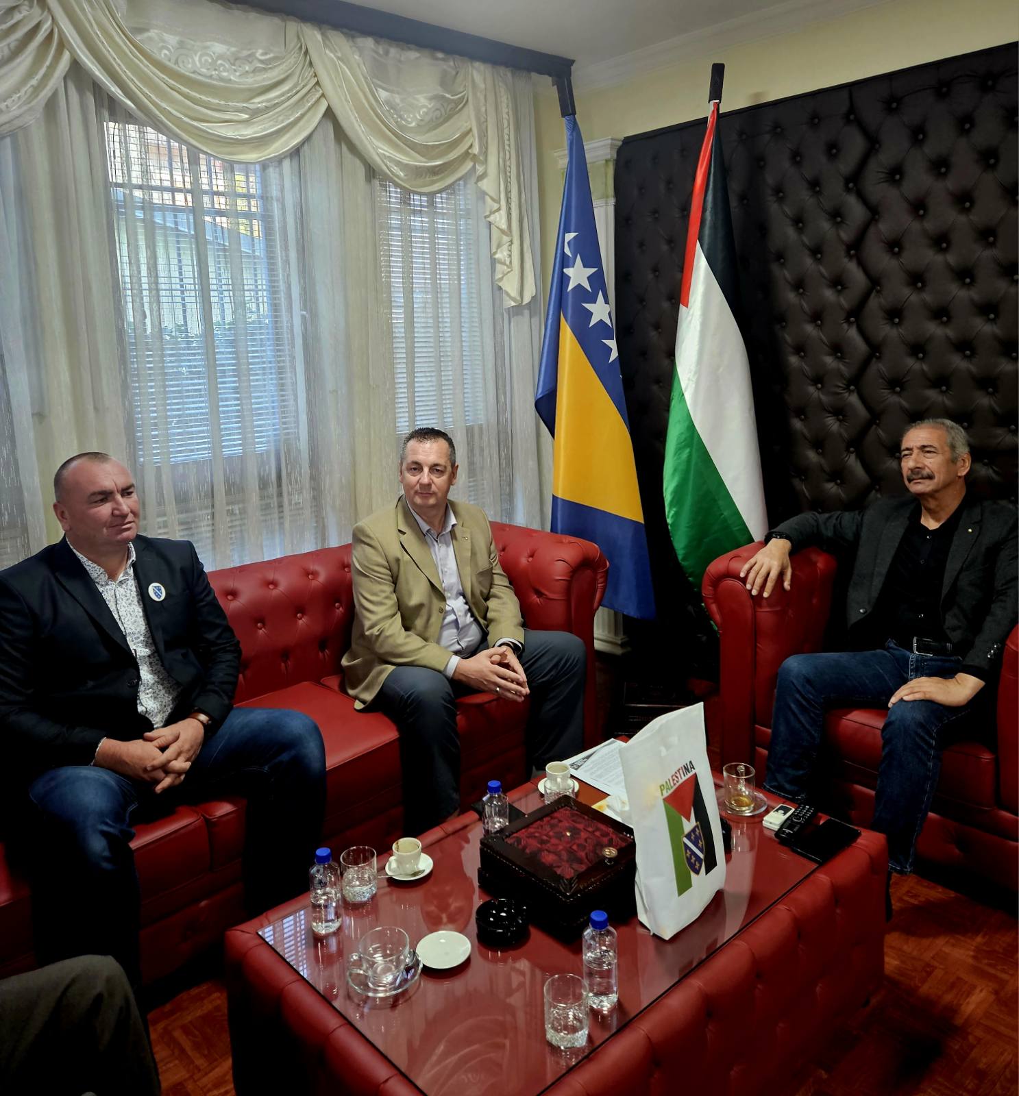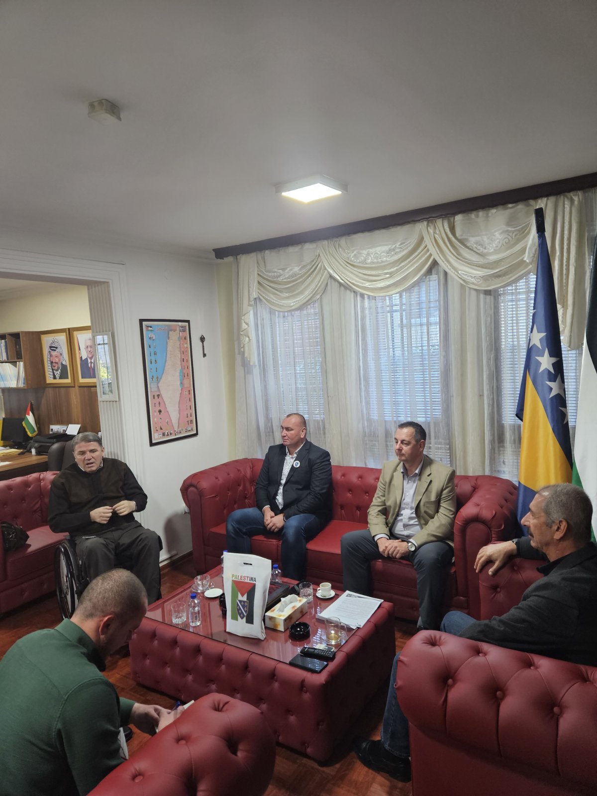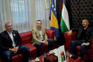Predstavnici nevladinih organizacija iz BiH ( Mujo Aganović, Jasmin Imamović i Kenan Karić) danas su posjetili ambasadu Palestine u BiH i susreli su se sa ambasadorom Palestine u BiH Rezeq Namoura i njegovim saradnicima. Tom prilikom su ambasadoru Rezeq Namouri uručili pismo podrške Palestini i palestinskom narodu od strane nevladinih organizacija iz BiH. U emotivnom susretu i razgovoru sa ambasadorom Palestine iskazali smo saosjećanje i veliku tugu zbog velike patnje i ubijanja civila, žena i preko 1.100 djece koje je Izrael mučki ubio u Gazi. Takođe smo u razgovoru iskazali i veliko poštovanje i ljubav prema palestinskom narodu koji iako već 75 godina trpi teror od strane države Izrael se ne predaje i ne odustaje od svoje domovine.