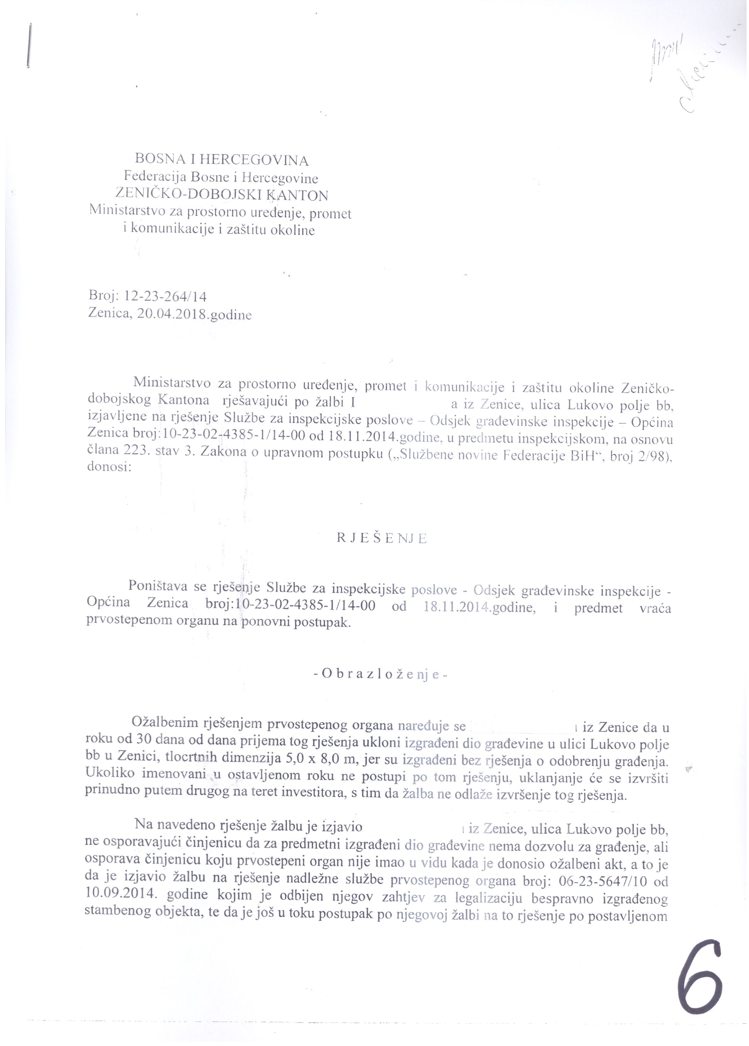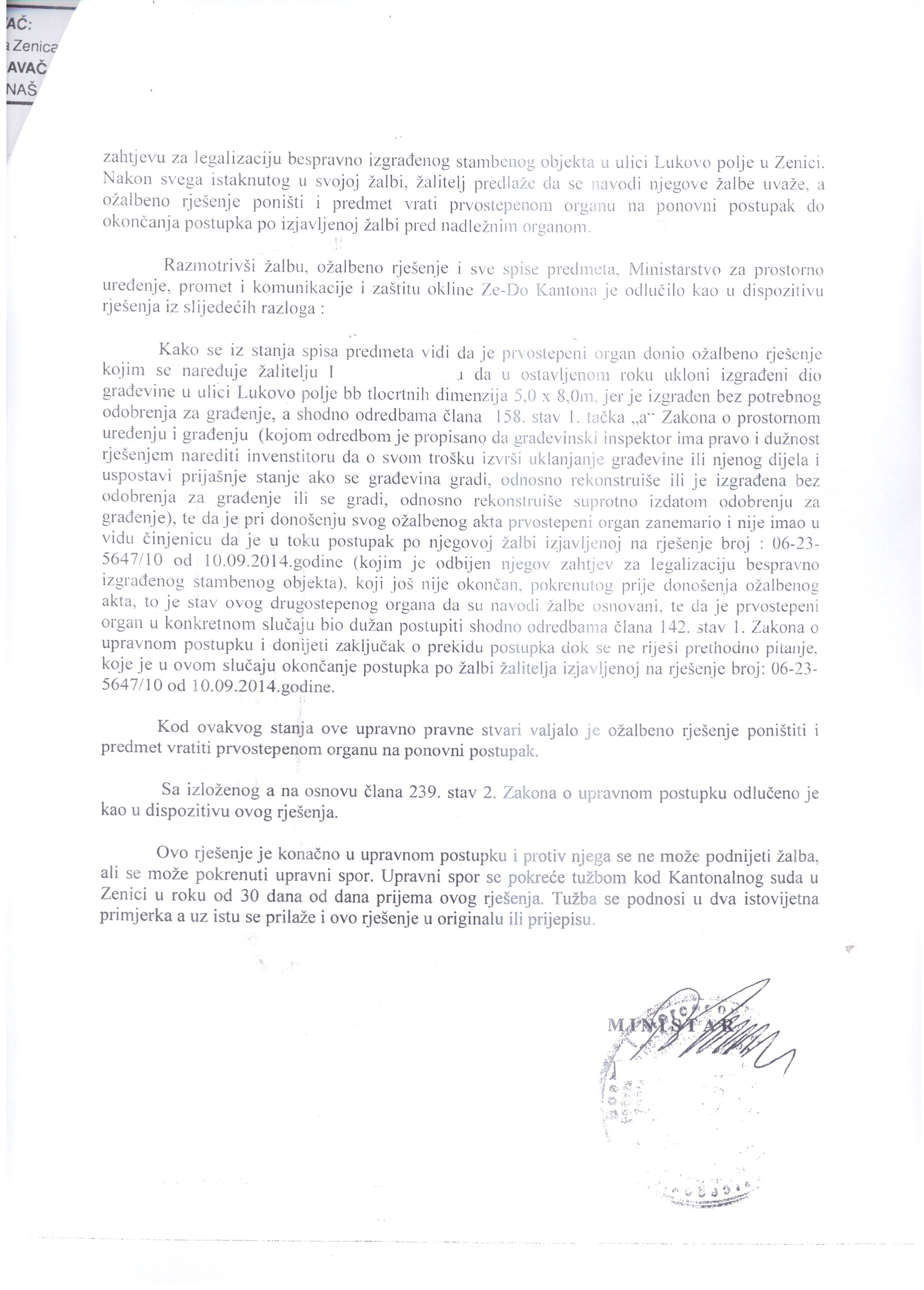 – već je ranije građevinski inspektor izdao riješenje o rušenju objekta, i gdje pravo žalbe ne odlaže izvršenje odluke, i gdje se nakon podnesene žalbe drugostepenom organu odlaže izvršenje ( iako su prekršene odredbe bar 4 zakona ), – napomena br. 1 na listu 5,
