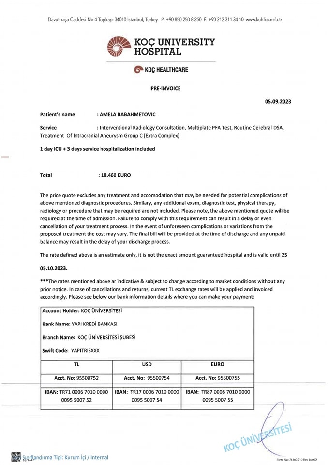 Naša Amela Porča Babahmetović, koja boluje od raka jednjaka, treba nas i ovaj put. Vjerujemo da ste već upoznati sa njenim stanjem koje je teško, neizvjesno i nažalost jako kritično. Svaka sekunda je važna, a jedini način, jedina šansa za nju je operacija za koju nedostaje 18460€ (po predračunu koji imate u prilogu).