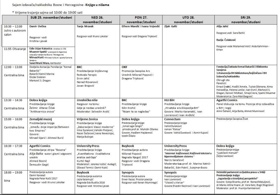 – Fokus sajma je na predstavljanju domaće izdavačke produkcije i promoviranju bh. autora u okviru posebnih programskih sadržaja poput: Predstavljanje autora, Promocija knjiga, Razgovor o temi, Predstavljanje regionalnih sajmova, Predstavljanje književnih časopisa, Strip-radionice, Javni razgovori… Trudili smo se da sajam ne pretrpamo sadržajima, ali i da posjetioci ne ostanu ičim uskraćeni. Gosti sajma bit će: Damir Ovčina, Selvedin Avdić, Milorad Popović, Kruno Lokotar, Sonja Biserko, Husnija Kamberović, Ivan Sivrić, Ivana Vojvodić, Ervin Jahić, Marko Tomaš, Nenad Rizvanović, Tanja Mravak, Želimir Altarac Čičak, Mirsad Sijarić, Zijad Gafić, Ivan Lovrenović, Nail Kurtić, Marko Karamatić… Mislim da imamo veoma zanimljiv i kvalitetan sajamski program i da će ljubitelji knjige uživati u svih pet sajamskih dana u BKC-u. Ja ih i ovim putem pozivam da svakako dođu u BKC od 25. do 29. 11. 2017. godine.