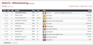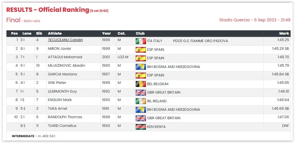 Pobjedu je odnio Italijan Catalin Tecuceanu s vremenom 1:45.25, dok je bronzu uzeo Španac Javier Miron (1:45.29). Mujezinoviću je za devet stotinki pobjegla bronzana medalja koja je otišla u ruke Španca Mohameda Attaouija (1:45.70).