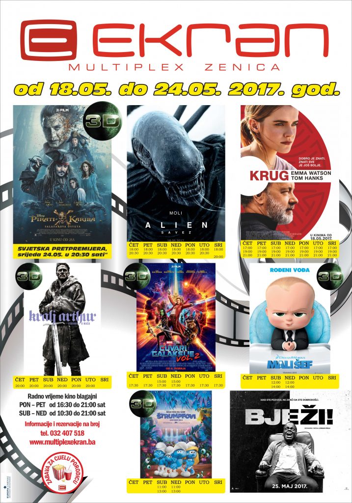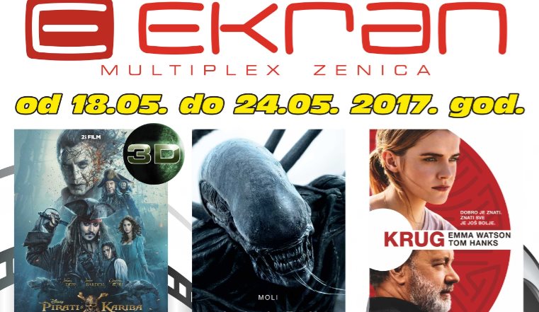 MULTIPLEX EKRAN najava: – Od 18. maja ne propustite pogledati nevjerovatni SF triler “ALIEN: SAVEZ” i dramu koja će vas ostaviti bez daha “KRUG” a 24.05. od 20:30 sati uživajte u PRETPREMIJERNOJ projekciji filma “PIRATI S KARIBA: SALAZAROVA OSVETA (3D)”