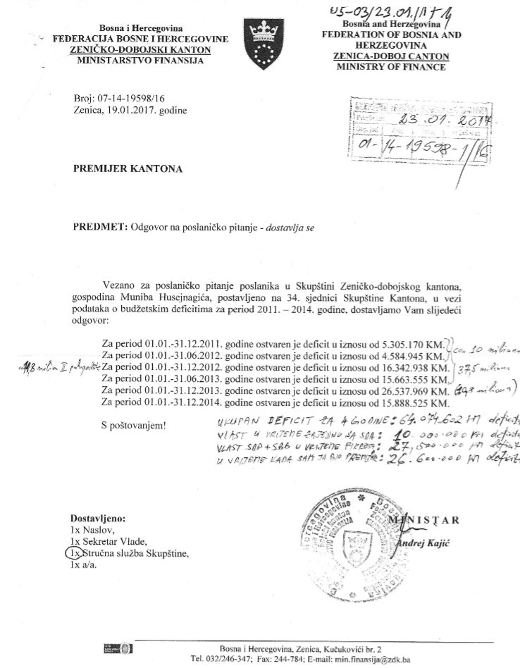 Notorna je laž da sam ja za vrijeme svog mandata napravio budžetski deficit od 64 miliona. Istina je da je taj deficit bio 26,6 miliona što dokumentujem službenim aktom Ministarstva finansija od 19.01.2017.godine. Nekorektno je da deficit od cca 10 miliona koji su napravili dok su oni (SDA) bili u Vladi do 31.06.2012.godine pripisuju meni. Namjerno obmanjuju javnost sa lažnim ciframa deficita i neplaćenih obaveza jer te dvije stvari neupućeni sabiraju, a u stvari je logično da će iznos ostvarenog deficita ostati približno iznosu neplaćenih računa. Kada govore o neredovnim isplatama prema porodiljama, borcima i ostalim socijalnim kategorijama ponovo ističem da sam za vrijeme mandata isplatio sve mjesečne tranše prema ovim kategorijama i dvije mjesečne tranše smanjio zatečeni zaostatak i to u vrijeme kada su bili znatno smanjeni prilivi u budžetu, zbog poznatih nemira i prirodne katastrofe koja nas je zadesila. Ova „Vlada na kredit“ nema pravo da nekom drži lekcije kada je za samo tri godine mandata sebi kroz budžet obezbjedila 70 miliona kredita. Jasno je svima da sam kojim slučajem podigao samo jedan kredit u iznosu od njihovog ovogodišnjeg kredita koji iznosi 30 miliona, mogao sam sve obaveze na vrijeme isplaćivati i još napraviti suficit.