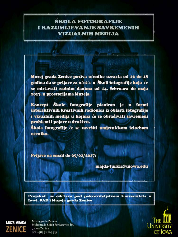 Muzej Grada Zenica: prijavi se u školu fotografije – ŠKOLA FOTOGRAFIJE I RAZUMIJEVANJE SAVREMENIH VIZUALNIH MEDIJA – Muzej grada Zenice poziva učenike uzrasta od 12 do 18 godina da se prijave za učešće u Školi fotografije koja će se održavati radnim danima od 14. februara do maja 2017. u prostorijama Muzeja.