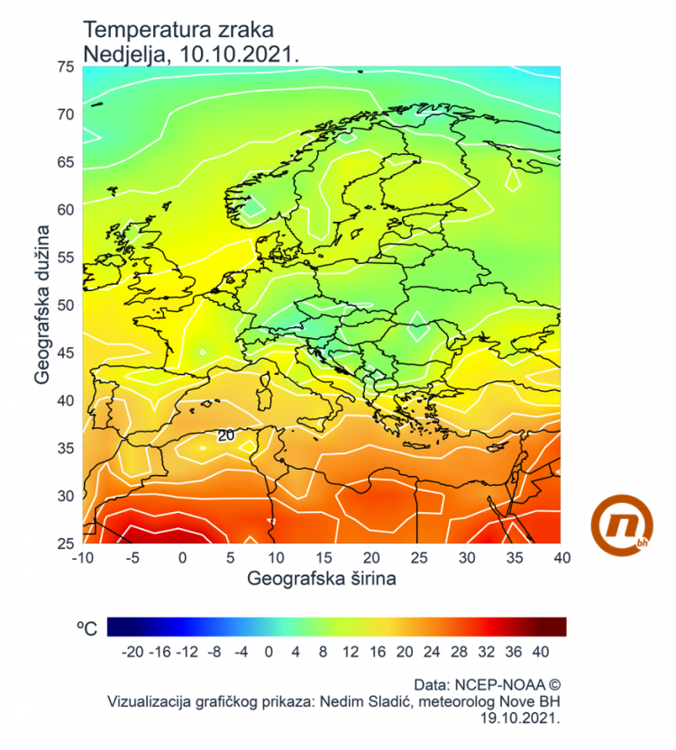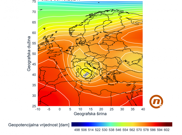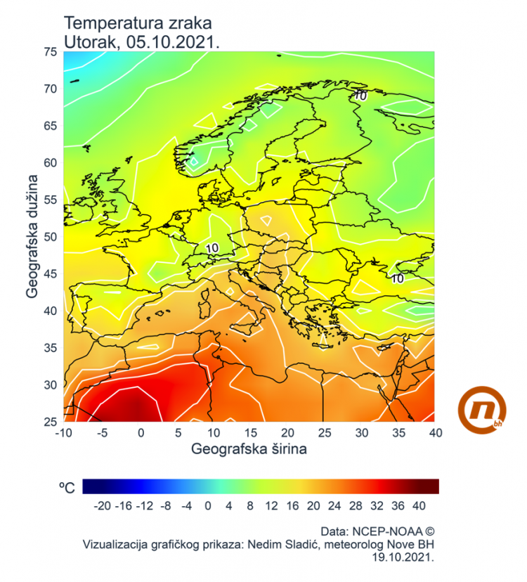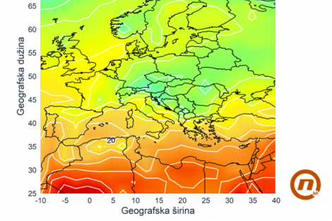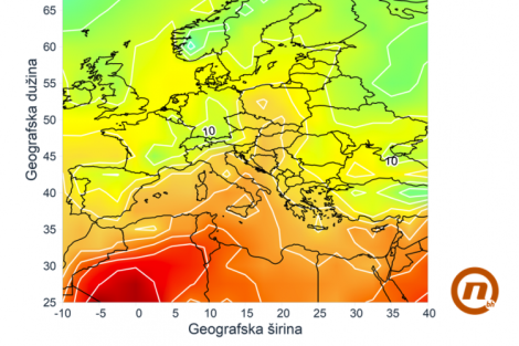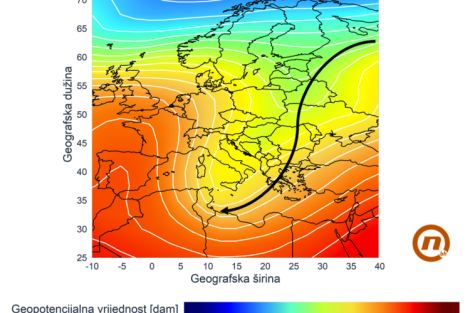 Razlog ovakve vremenske situacije potražujemo u snažnom prodoru hladnijeg zraka sa sjevera, što vidimo po ovim zelenim nijansama koje se od sjeveroistoka Europe protežu osom do samog juga Europe (Figura 1 – prikazana strelicom), dok linije na karti temperaturnog polja povezuju mjesta sa istom temperaturom zraka, sa razmakom između od 5 ºC. (Figura 2 i 3).