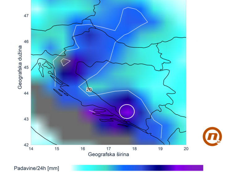 Najviše kiše je palo na području zapadne Bosne, u Hercegovini i Krajini, gdje je mjestimično u tri dana palo preko polovine ukupnog mjesečnog prosjeka, a na području Mostara i Neuma jače grmljavinsko nevrijeme je pred kraj prve dekade mjeseca uzrokovalo i bujične poplave, gdje je mjestimice palo i preko 50 mm kiše u kratkom vremenskom periodu (Figura 5 – označeno ljubičastom bojom i bijelim krugom).