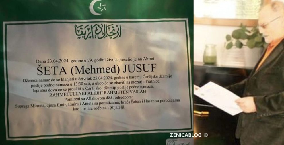 Danas poslije podne namaza, u 13.30 sati u haremu Čaršijske džamije u Zenici biće klanjana dženaza našem sugrađaninu Jusufu Šeti. Ukop će biti obavljen na mezarju Prašnice.