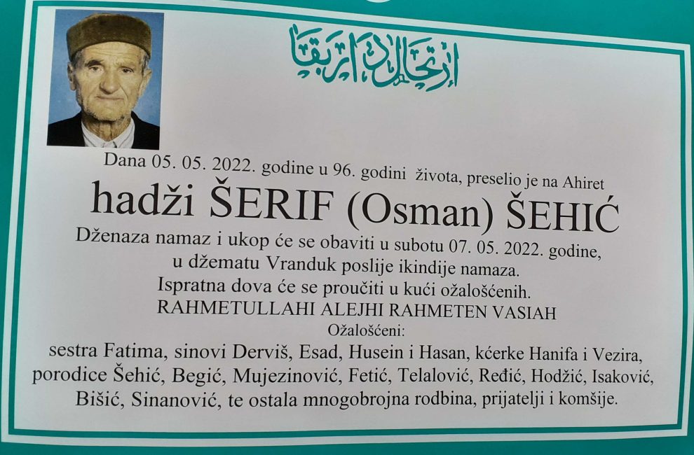 U četvrtak 05.maja 2022.godine na Ahiret je preselio najstariji Vrandučanin, hadži Šerif (Osmana) Šehić, u svojoj 96.godini života. Rođen je u Vranduku 1926. godine, gdje je živio cijeli život.  Bio je veoma omiljen u društvu i uvijek raspoložen za razgovor, redovan džematlija u džamiji u svome prvom safu, u koji je redovno dolazio dok ga je zdravlje služilo. Nešto o hadži Šerifu kazao nam je imam Vrandučke džamije, Ramiz ef. Redžić, koji je ovdje na službi već desetak  godina: