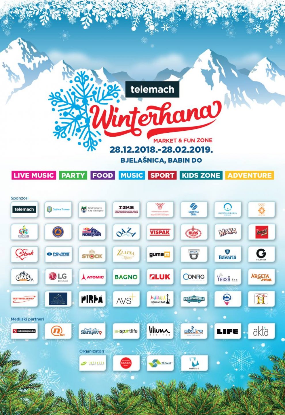 Partneri i sponzori Telemach Winterhane market &fun zone 2019 su: Općina Trnovo, Turistička zajednica Kantona Sarajevo, Grad Sarajevo, JP Sarajevo, ZOI 84, Telemach, Federalna Uprava Civilne Zaštite, EYOF, Red Bull Home Run, AS Holding – Oaza, Vispak, Klas, Maza, Smoki mini, Soko Štark, Dacia – Guma M, Polaris, Pirpa, Mahala hookah bar, Gelender, Stock BH, Zlatna rakija, Bavaria, AVS+, LG, Stanić Trade, Hadžić gradnja, Yassadoo, Limsar, GMS Outdoor, Atomic Comprexd.o.o. i Config.