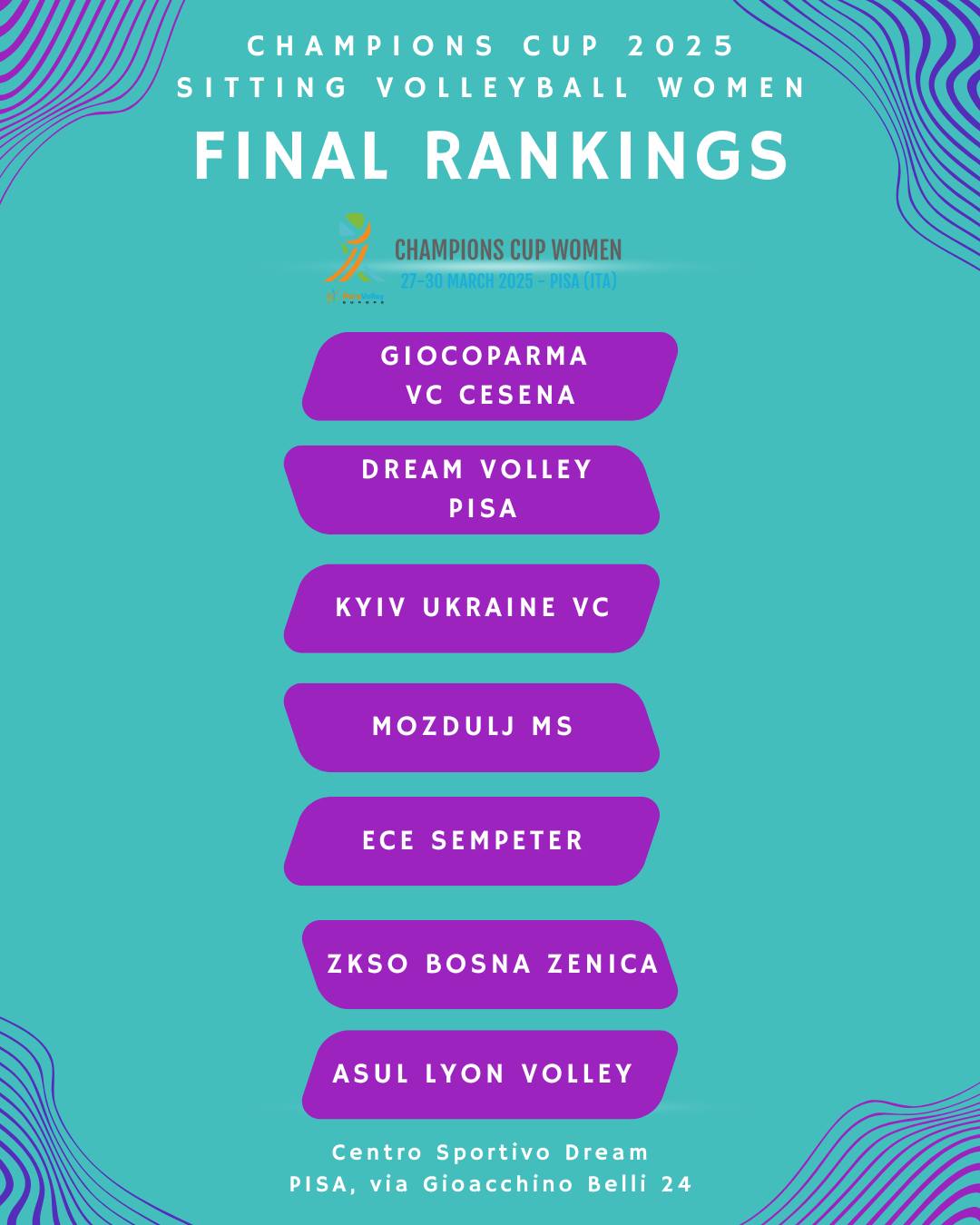 Ženski klub sjedeće odbojke Bosna iz Zenice osvanjem 6. mjesta završio je svoj prvi nastup u „Champions Cup-u 2025“. Finalni turnir najboljih europskih ženskih ekipa u sjedećoj odbojci odigran je od 27. do 30. marta u Pisi. Sa dvije pobjede u pet odigranih utakmica, uz nepovoljan žrijeb gdje su u grupi bile sa finalisticama, italijanskim ekipama „Giocoparma vc Cesena“ i „Dream Volley Pisa“, odbojkašice trenera Ferhata Šehića i Peje Kikića opravdale su poziv za učešće na ovom takmičenju koje im je kao nagradu za rad u prethodnim godinama poslala organizacija „Paravolley Europe“.