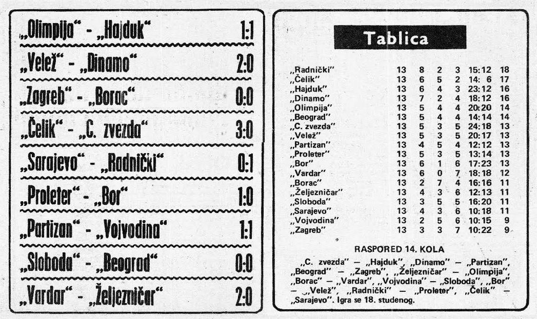 Zenica, 11. novembar 1973. Stadion Bilino Polje. Gledalaca 25.000. Vrijeme oblačno i prohladno, teren pogodan za igru. Sudija: Josip Strmečki (Zagreb). Žuti karton: Šljoka (Čelik). Strijelci: 1:0 Bokan (24), 2:0 Renić (51), 3:0 Renić (73).