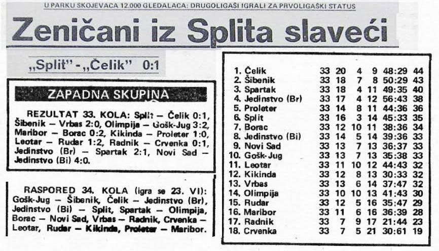 Split, 16. juni 1985. Stadion u Parku skojevaca. Gledalaca 12.000. Vrijeme sparno, teren pogodan za igru. Sudija: Klikić (Banja Luka). Strijelac: 0:1 Mujičić (34).