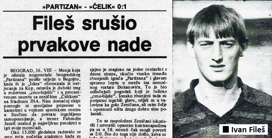 Samo tri minute kasnije slavlje Zeničana: Miodrag Đurđević je centrirao s desne strane, a Fileš bio brži od Đukanovića i glavom zatresao mrežu (0:1). Do kraja poluvremena najbolju šansu za Partizan imao je Vučićević, čiji je udarac atraktivnom paradom zaustavio Radović. I u drugom poluvremenu Čelik nije nimalo inferioran. Naprotiv… U 50. minuti je Darko Nestorović bio sâm pred Đukanovićem, ali je previše oklijevao i dozvolio Klinčarskom da ga blokira.