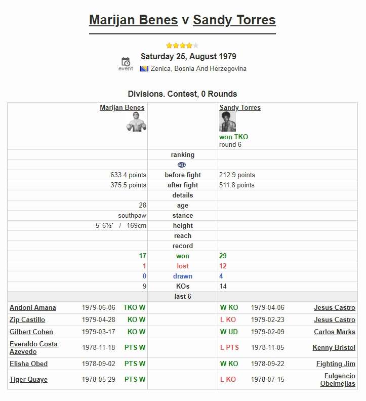 Naime, na današnji dan, 25. avgusta prije 40 godina (1979.) u Zenici je održan istorijski boks meč, između našeg šampiona Marijana Beneša i Sandija Toresa (Sandy Torres). Samo dva i po mjeseca nakon što je uništio karijeru Špancu Amani, Beneš je stigao u Zenicu, gdje je za protivnika imao Amerikanca portorikanskog porijekla.