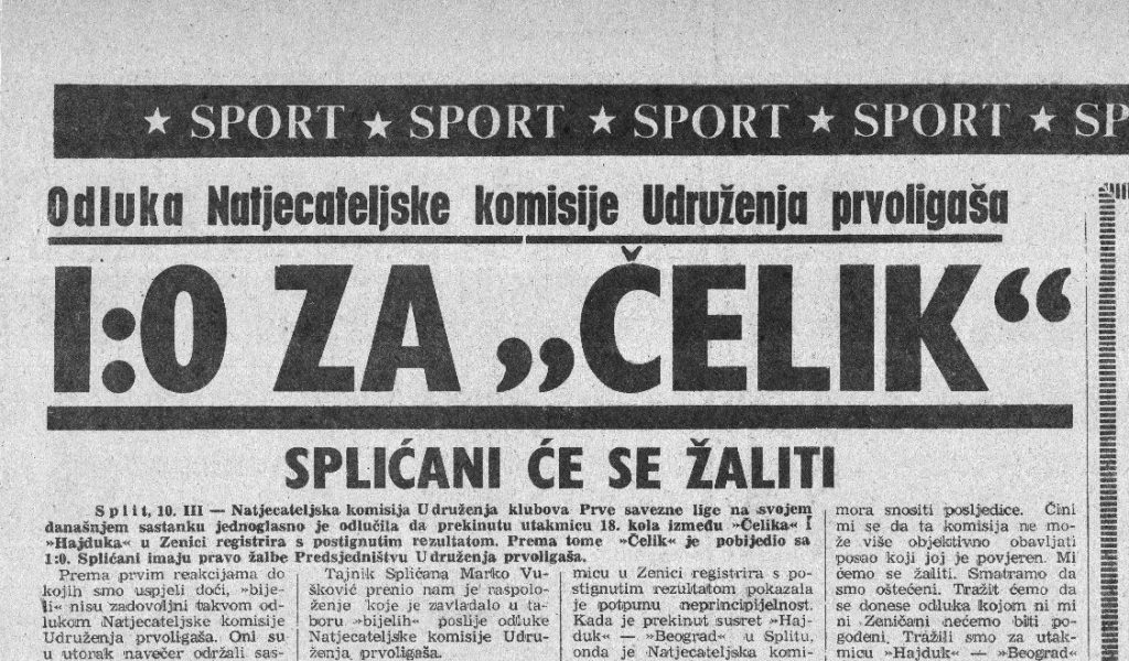 Tri dana kasnije Takmičarska komisija Fudbalskog saveza Jugoslavije donijela je odluka da se utakmica registrira rezultatom 1:0 za Čelik što je izazvalo nezadovoljstvo u Splitu, ali i cijeloj Hrvatskoj. Jer, skoro istovremeno sa “slučajem Bošković” u Zenici, desila se afera u Prvenstvu Jugoslavije u košarci, a ponovo je u glavnoj ulozi bio klub iz Splita.