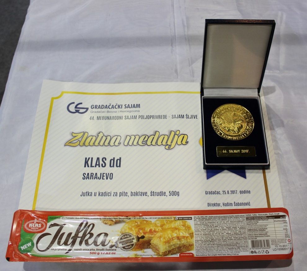 Na Međunarodnom sajmu poljoprivrede i prehrambene industrije u Gradačcu zlatna medalja za kvalitet Klas Jufke u inovativnom pakovanju – Jufka u posudi prehrambene industrije Klas d.d. Sarajevo nagrađena je Zlatnom medaljom za kvalitet na Međunarodnom sajmu poljoprivrede i prehrambene industrije koji se održava u Gradačcu. Iza ocjene kvaliteta proizvoda stoje uvaženi profesori Poljoprivredno-prehrambenog fakulteta u Sarajevu, kao najstarije visokoškolske institucije u BiH