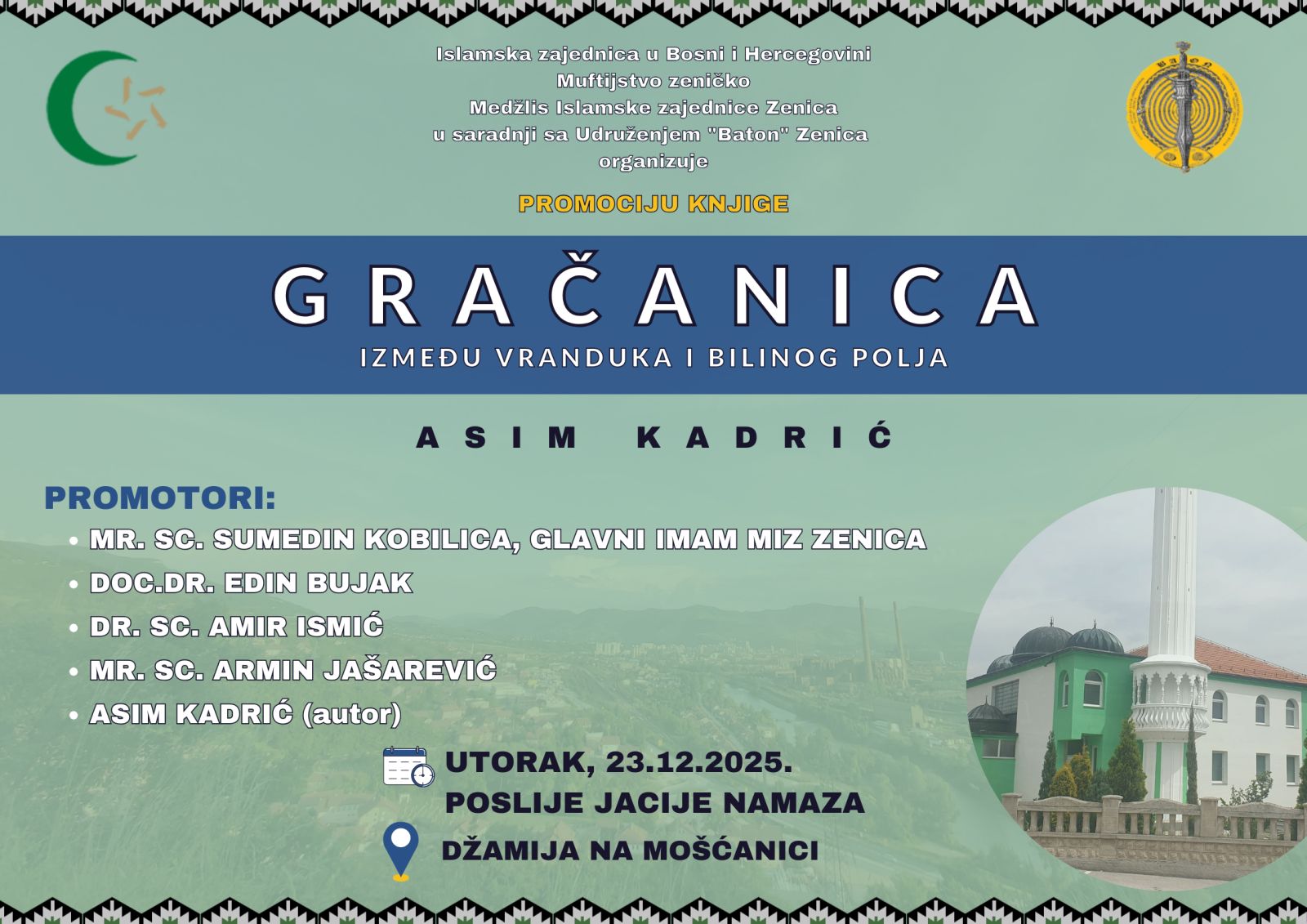 Dana 23. decembra 2025. godine Udruženje građana ,,Baton“ Zenica, u saradnji s Medžlisom Islamske zajednice Zenica, u džematu Moćanica organizovalo je promociju historijske monografije „Gračanica između Vranduka i Bilinog polja“ autora Asima Kadrića.
