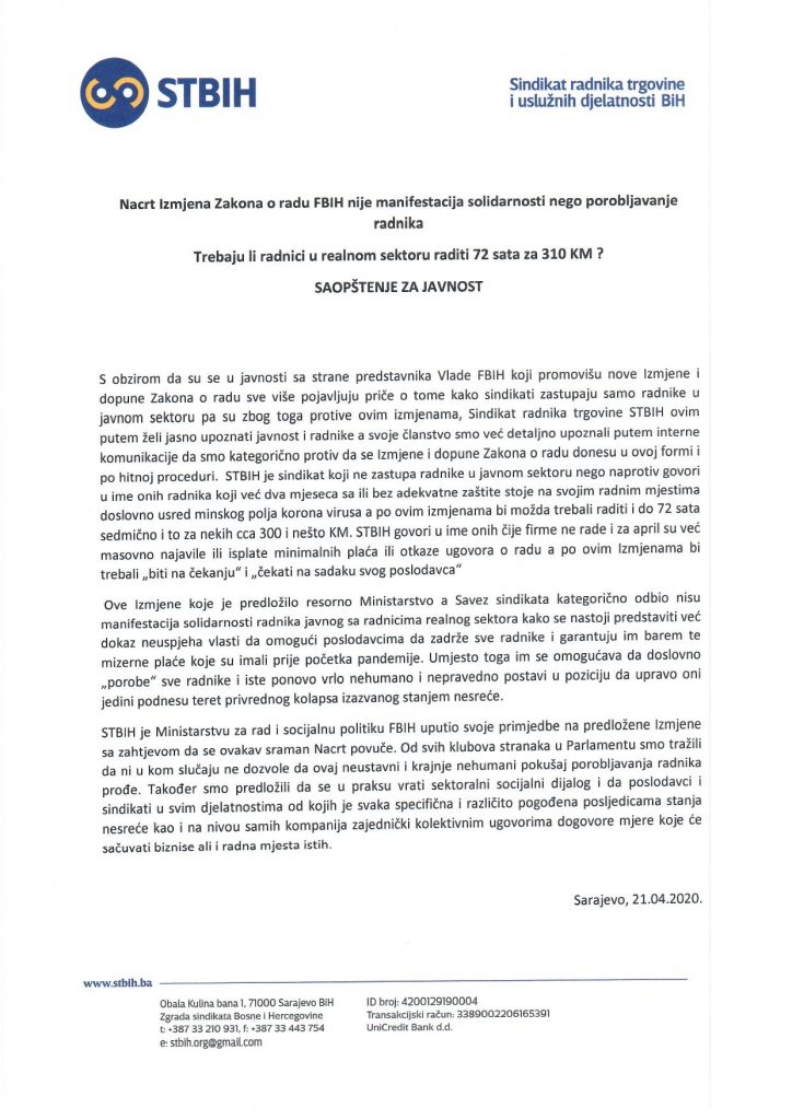 Nacrt Izmjena Zakona o radu FBIH nije manifestacija solidarnosti nego porobljavanje radnika: Trebaju li radnici u realnom sektoru raditi 72 sata za 310 KM? – S obzirom da su se u javnosti sa strane predstavnika Vlade FBIH koji promovišu nove Izmjene i dopune Zakona o radu sve više pojavljuju priče o tome kako sindikati zastupaju samo radnike u javnom sektoru pa su zbog toga protive ovim izmjenama, Sindikat radnika trgovine STBIH ovim putem želi jasno upoznati javnost i radnike a svoje članstvo smo već detaljno upoznali putem interne komunikacije da smo kategorično protiv da se Izmjene i dopune Zakona o radu donesu u ovoj formi i po hitnoj proceduri.