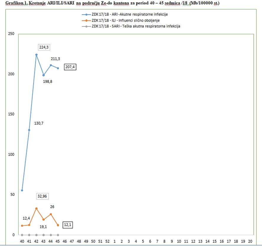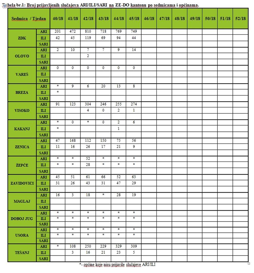 Nadzor nad gripom u ZDK – Izvještaj za 45. sedmicu 2018. – Na teritoriji ZDK tokom 45. sedmice evidentirano je ukupno 749 oboljelih od akutnih respiratornih infekcije (ARI), te 44 influenci sličnih oboljenja (ILI), što je ukupno 70 evidentiranih oboljelih osoba mamje, nego u 44. sedmici ove godine. Najveći broj oboljelih evidentiran je i dalje u Tešnju (309 ARI i 5 ILI), te Visokom (274 ARI i 1 ILI).