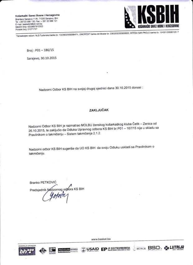 Nadzorni odbor KS BiH – Košarkaškog saveza Bosne i Hercegovine odlučio je danas na sjednici u Sarajevu da odluka Upravnog odbora KSBiH vezana za učešće ženskih košarkaških klubova Čelik i Play Off u prvom dijelu prvenstva BiH nije u skladu s aktima Saveza, odnosno s pravilnikom o takmičenju – izjavio je generalni sekretar KSBiH Harun Mahmutović.