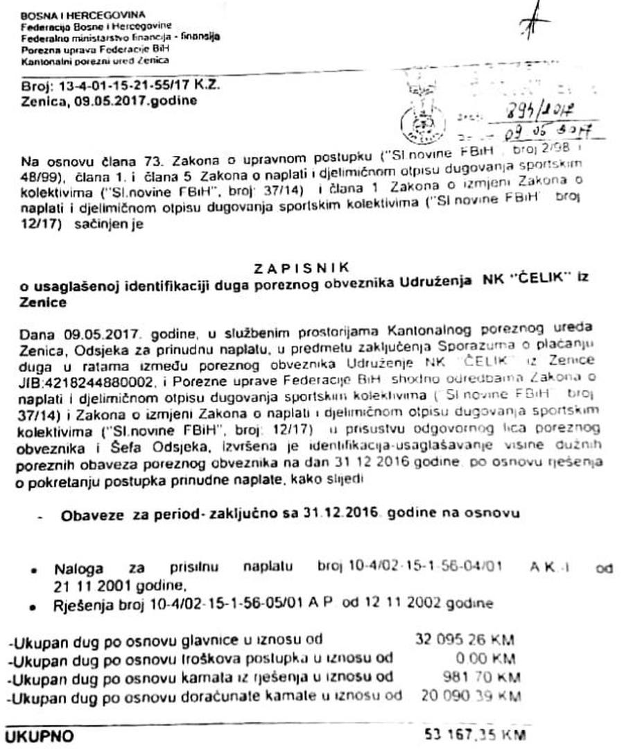 Naime, prema zvaničnom dokumentu iz Porezne uprave FBiH od 09.05.2017. – Zapisniku o usaglašenoj identifikaciji duga, dugovanja NK Čelik Zenica prema toj instituciji iznose 6.750.116,22 KM, od čega na glavnicu, koja bi se vraćala po potpisu reprograma, otpada 2.492.996,16 KM što je znatno manji iznos od spomenutih „10 miliona KM“.