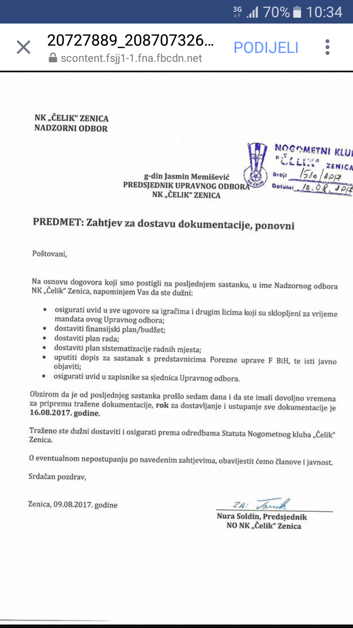 Nadzorni odbor NK Čelik: Upravni odbor se oglušio na zahtjeve i tako još jednom prekršio statut kluba – Upravni odbor NK Čelik Zenica ni nakon 15 dana nije ispunio nijedan od zahtjeva koje je uputio Nadzorni odbor kluba. I pored usmenog dogovora na sastanku i pored pismenog zahtjeva, Upravni odbor se još jednom oglušio na zahtjeve i tako još jednom izravno prekršio statut.