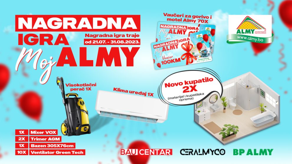 Svi kupci koji naprave račun veći od 50KM u Baucentrima ALMY ili salonima Ceralmyco u Zenici i Zavidovićima, kao i na benzinskim pumpama Almy u Zenici, Sarajevu i Zavidovićima u periodu od 21.07. do 31.08.2023., ostvaruju pravo na učešće u nagradnoj igri!