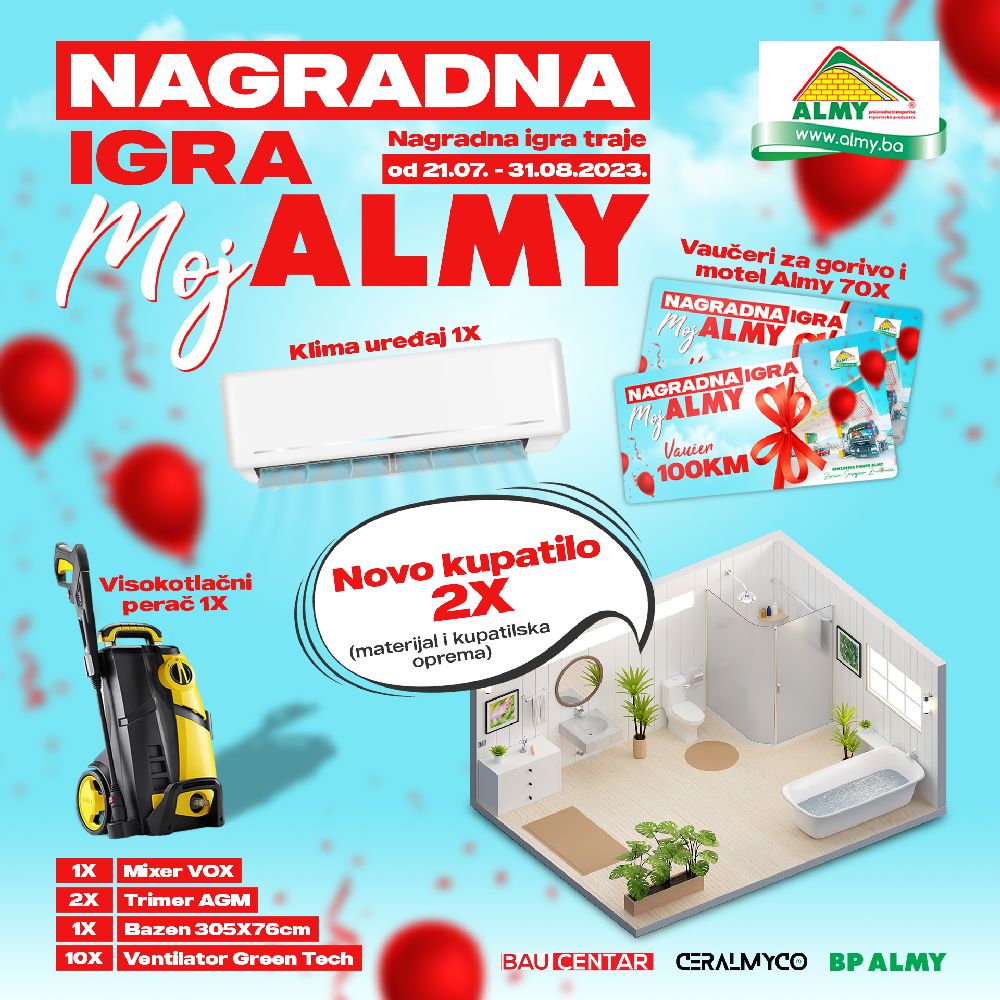 Svi kupci koji naprave račun veći od 50KM u Baucentrima ALMY ili salonima Ceralmyco u Zenici i Zavidovićima, kao i na benzinskim pumpama Almy u Zenici, Sarajevu i Zavidovićima u periodu od 21.07. do 31.08.2023., ostvaruju pravo na učešće u nagradnoj igri!