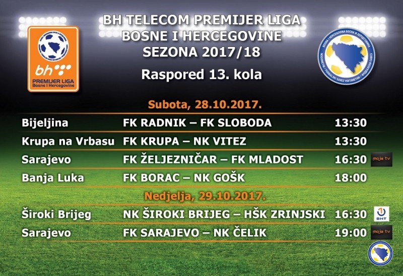 Donosimo kompletan raspored utakmica 13.kola (28.10./29.10.2017.god.), parovi – satnica, TV: