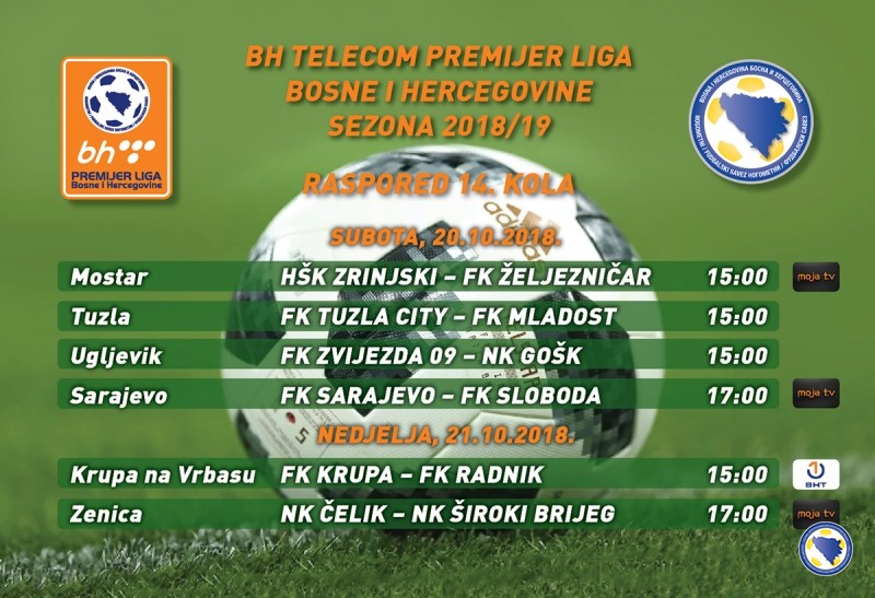 Najava 14. kola BHT Premijer nogometne lige BiH – Čelik u nedjelju domaćin Širokom Brijegu u 17 sati – Nakon reprezentativne pauze, ovog vikenda igraju se utakmice 14.kola BH Telekom Premijer nogometne lige Bosne i Hercegovine. Četiri utakmice na rasporedu su u subotu, a dvije u nedjelju. Četiri utakmice će biti u direktnom prijenosu i to jedna na BHT1, a tri na platformi Moja TV.