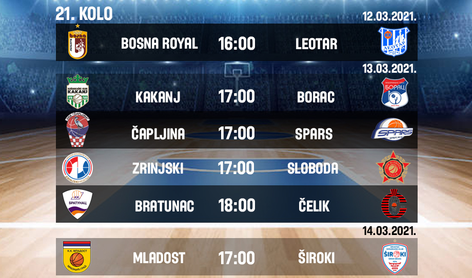 Danas, 12.3.2021.godine, bit će odigrana prva utakmica 21. kola u kojoj će se sastati Bosna Royal i Leotar.