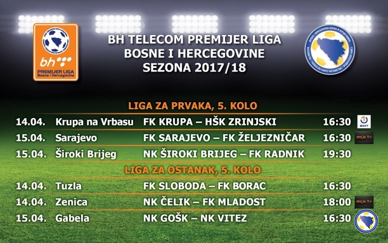 Najava 5.kola Lige za prvaka i Lige za opstanak BHT Premijer lige BiH – Čelik domaćin Mladosti DK u subotu u 18 sati  – Petim kolom, ovog vikenda, nastavlja se BHT Premijer nogometna liga u Ligi za prvaka i Ligi za opstanak. Tri utakmice igraju se u subotu 14.aprila 2018.godine (jedna iz Lige za prvaka i dvije iz Lige za opstanak), a tri u nedjelju (dvije iz Lige za prvaka i jedna iz Lige za opstanak)