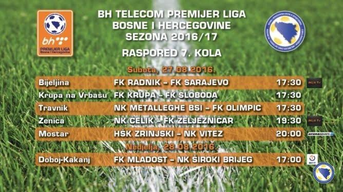 Donosimo kompletan raspored utakmica 7.kola (subota, 27.8./nedjelja, 28.8.2016.god.), parovi, satnica, TV: