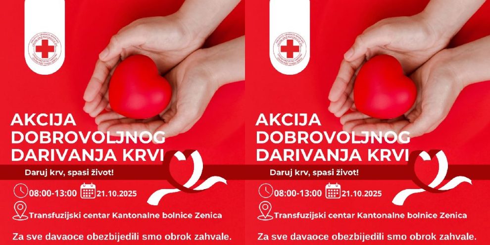 NAJAVA: Akcija dobrovoljnog darivanja krvi- Crveni križ Grada Zenica organizuje akciju dobrovoljnog darivanja krvi koja će se održati 21.10.2025. u utorak u vremenu od 8 do 13 sati u prostorijama Trasnfuzijskog centra KBZ.