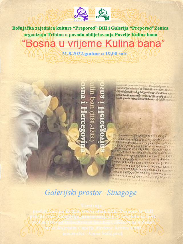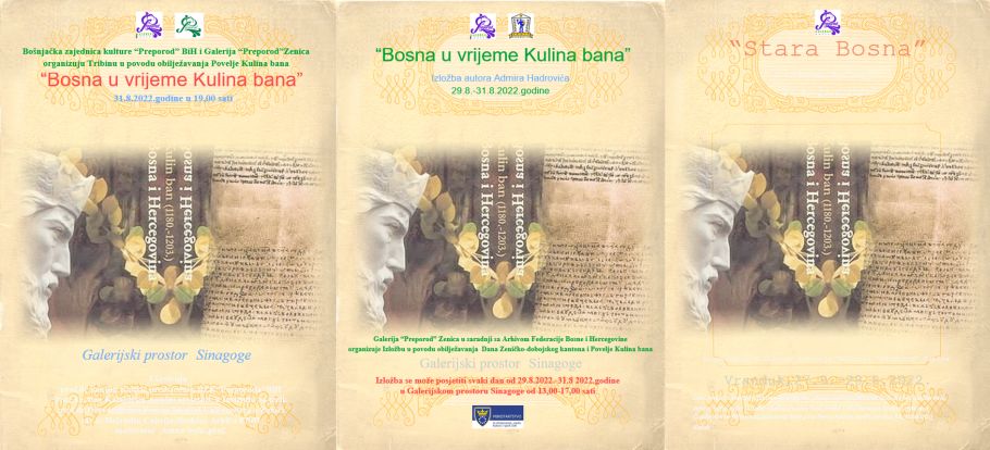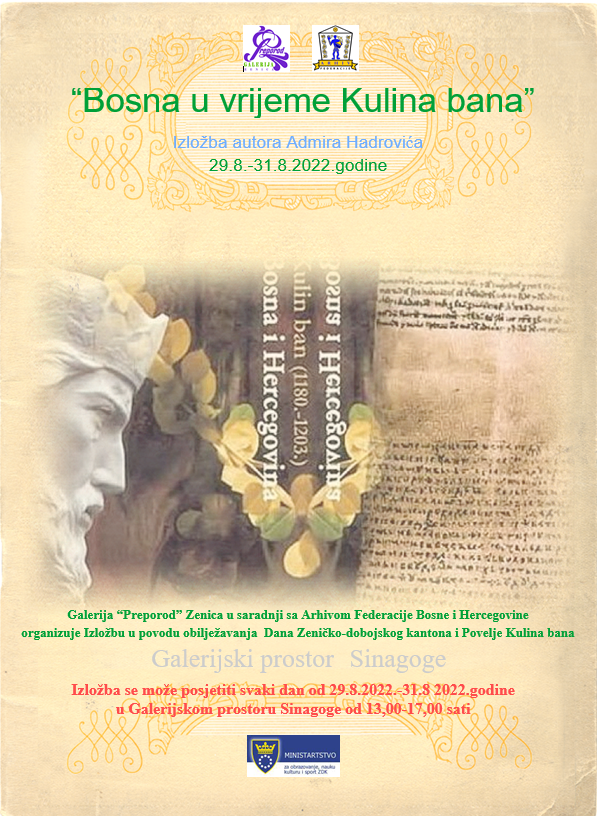 –Postavka Izložbe „Bosna u vrijeme Kulina bana“ autora Admira Hadrovića,višeg arhiviste Arhiva Federacije Bosne i Hercegovine.Izložba se sastoji od 15 panela sa tekstovima o Kulinu banu i historiji Bosne i Hercegovine.Izložba je poklon Galerije „Preporod“ Zenica Zeničko-dobojskom kantonu ,u povodu obilježavanja Dana Kantona.Izložba se organizuje u saradnji sa Arhivom Federacije Bosne i Hercegovine.Otvaranje izložbe planirana je 29.8.2022.godine u 12,00 sati u foaje zgrade Vlade Zeničko-dobojskog kantona.