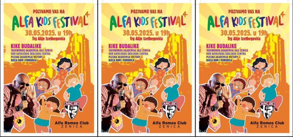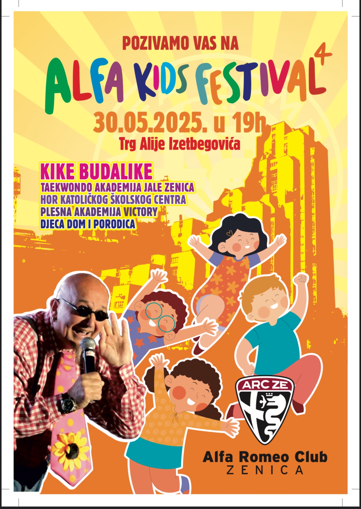U organizaciji Alfa Romeo Club-a Zenica, u petak 30. maja 2025. godine bit će održan četvrti Alfa Kids Fest, događaj namijenjen djeci i porodicama s ciljem promocije mira, zajedništva i edukativne zabave. Festival nosi snažnu poruku “Samo da rata ne bude”, a program je u potpunosti besplatan i otvoren za sve posjetioce.