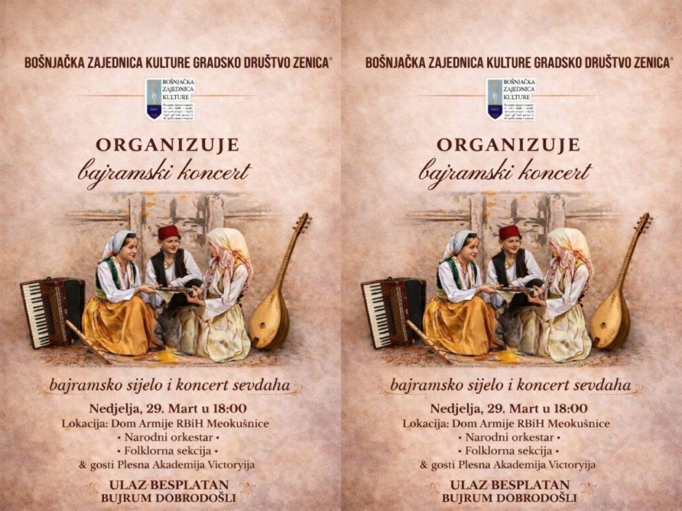 Bošnjačka zajednica kulture Gradsko društvo Zenica organizuje bajramski koncert povodom obilježavanja Bajrama, koji će biti održan u nedjelju, 29. marta s početkom u 18 sati u Domu Armije RBiH Meokušnice.