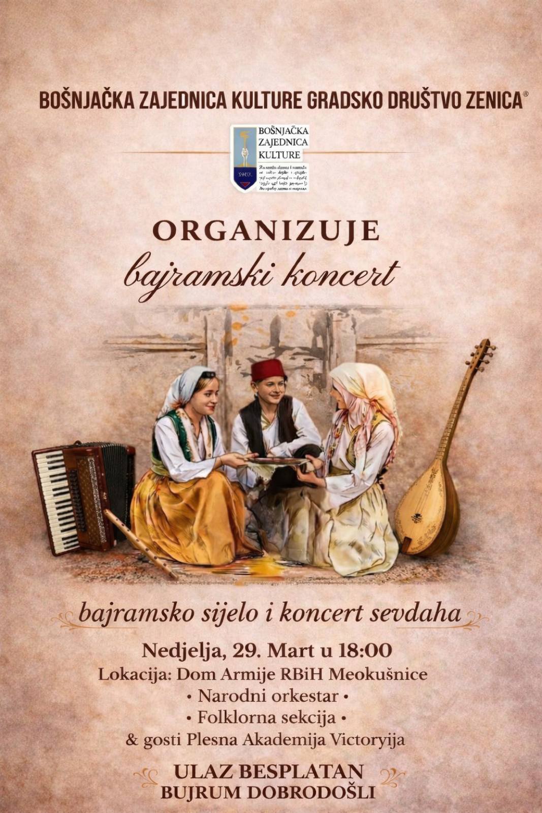 Bošnjačka zajednica kulture Gradsko društvo Zenica organizuje bajramski koncert povodom obilježavanja Bajrama, koji će biti održan u nedjelju, 29. marta s početkom u 18 sati u Domu Armije RBiH Meokušnice.