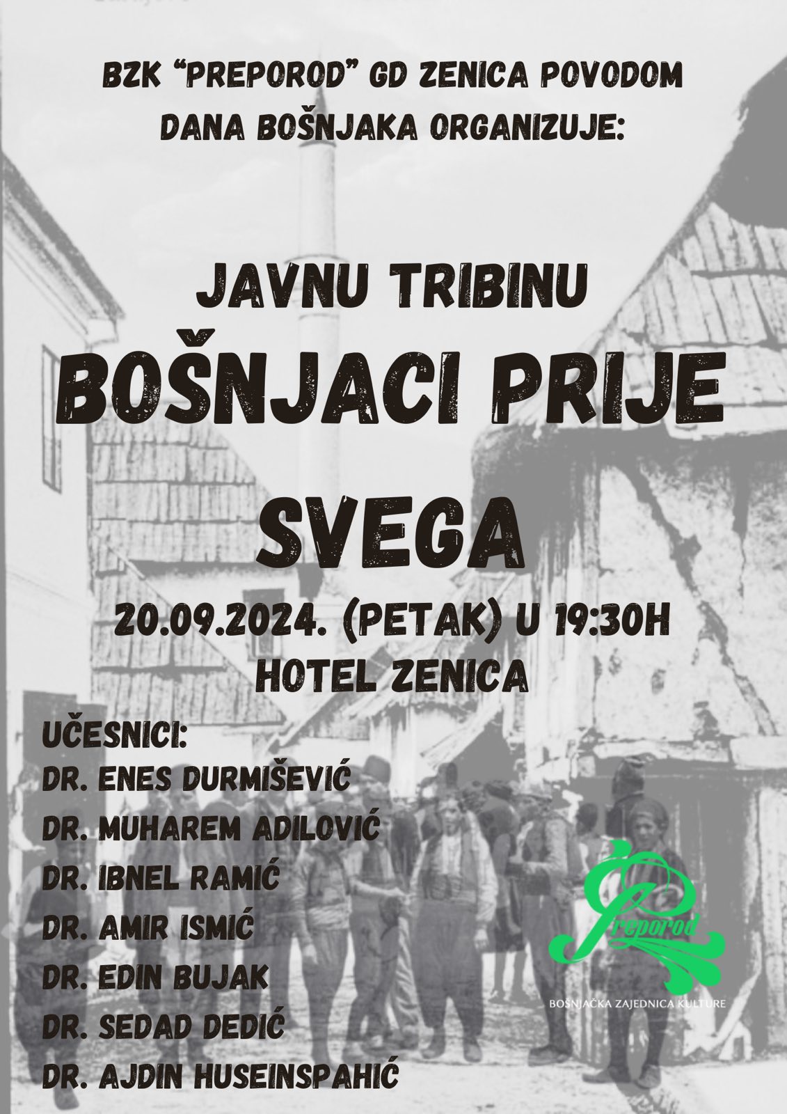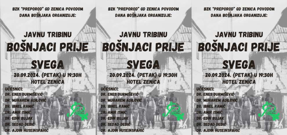 Poštovani sugrađani, dobri i plemeniti Bošnjani sve Vas najsrdačnije pozivamo na javnu tribinu koju BZK “PREPOROD” Gradsko društvo Zenica organizira 20.09.2024. od 19,30h u Hotelu Zenica.