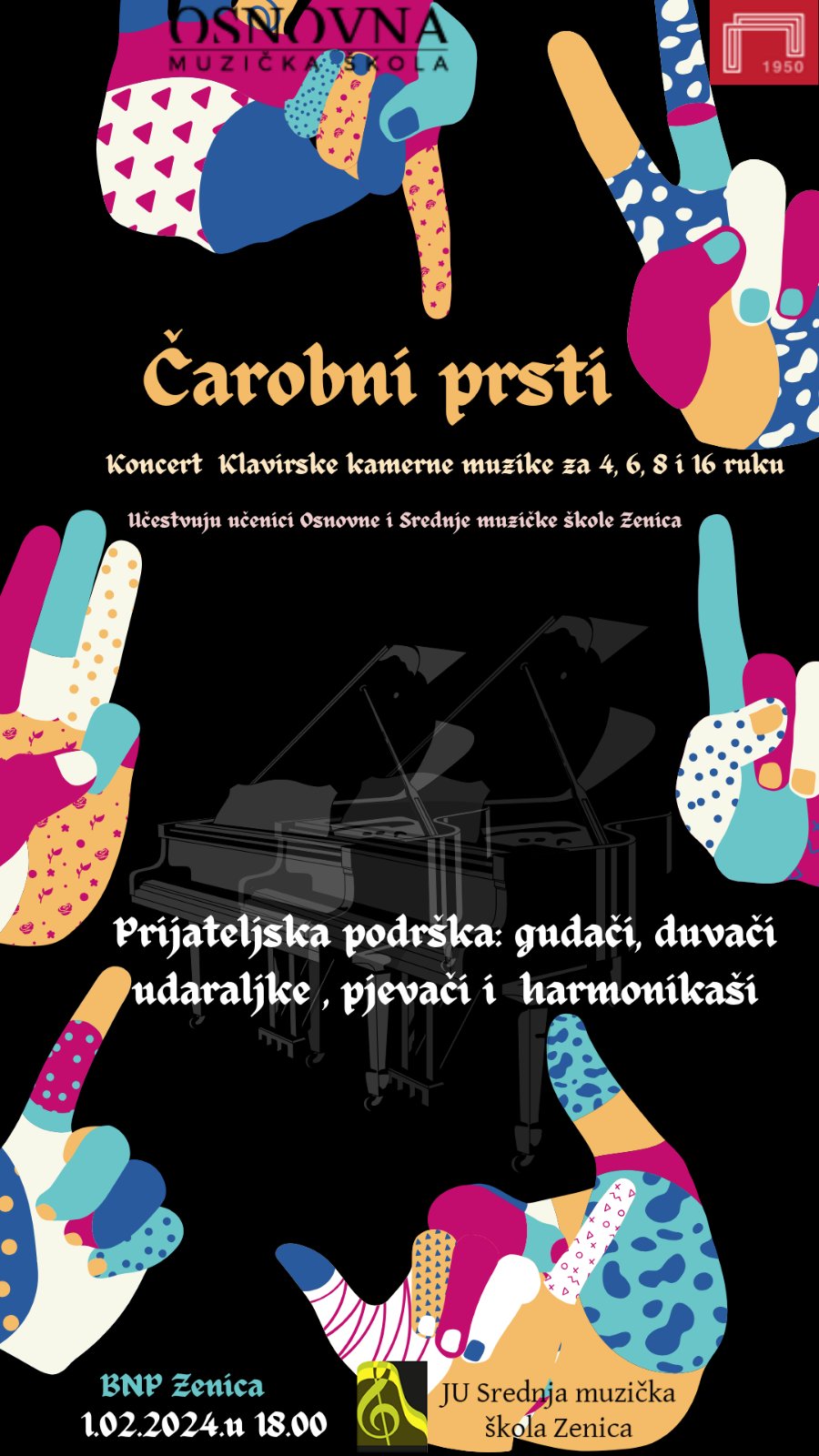 Na koncertu „Čarobni prsti“ bit će izvedene kompozicije za četiri ruke, kao i za šest, osam, ali i šesnaest ruku. Sve kompozicije se izvode na dva klavira, a učesnici koncerta su učenici Osnovne i Srednje muzičke škole. Gošće koncerta će biti učenice Muzičkog vrtića „Notica“ Zenica.
