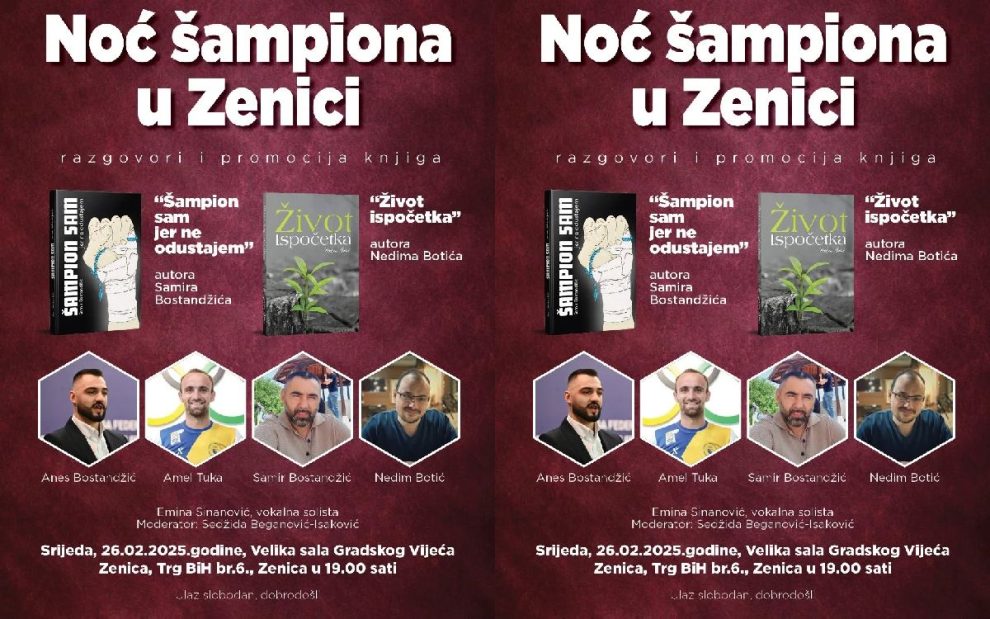 “Noć šampiona u Zenici”, srijeda 26.02.2025. godine u 19.00 sati, Velika sala Grada Zenica- druženje i promocija knjiga: “Šampion sam jer ne odsutajem”, priča oca Samira o viceprvaku svijeta u karateu Anesu Bostandžiću i “Život ispočetka” Nedima Botića.