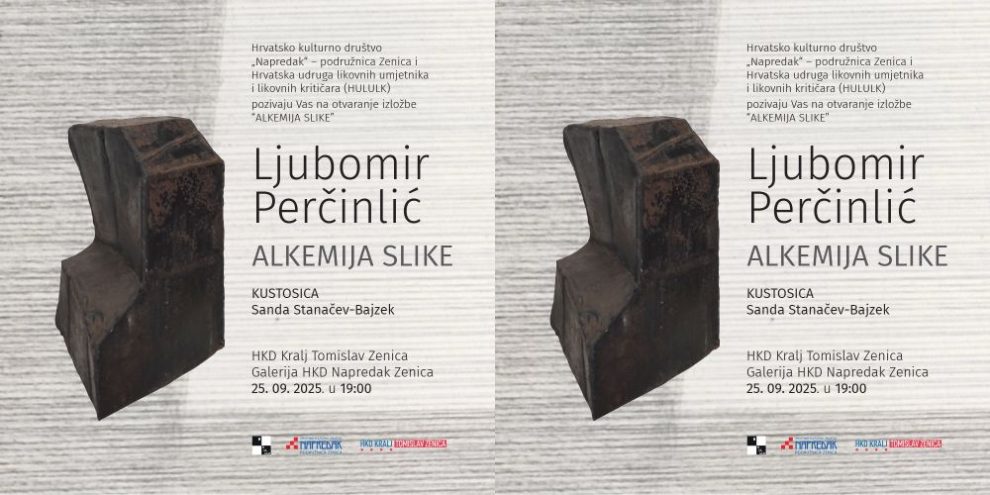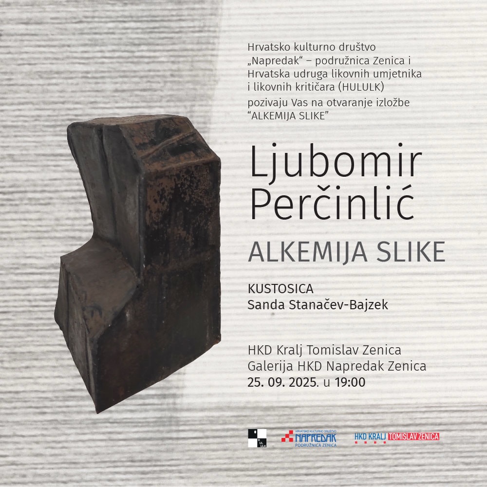 Hrvatsko kulturno društvo Napredak podružnica Zenica, Hrvatsko kulturno društvo Kralj Tomislav i Hrvatska udruga likovnih umjetnika (HULULK) pozivaju građane na svečano otvorenje izložbe “Alkemija slike” renomiranog autora Ljubomira Perčinlića.