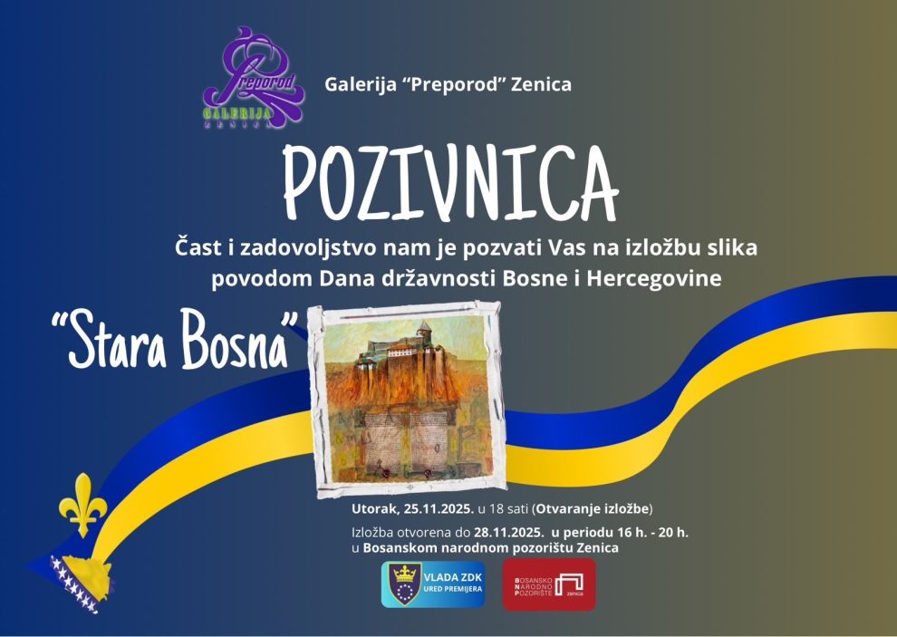 NAJAVA: Izložba povodom Dana državnosti BiH- Povodom obilježavanja Dana državnosti, Galerija “Preporod” Zenica postavlja izložbu slika „Stara Bosna“.