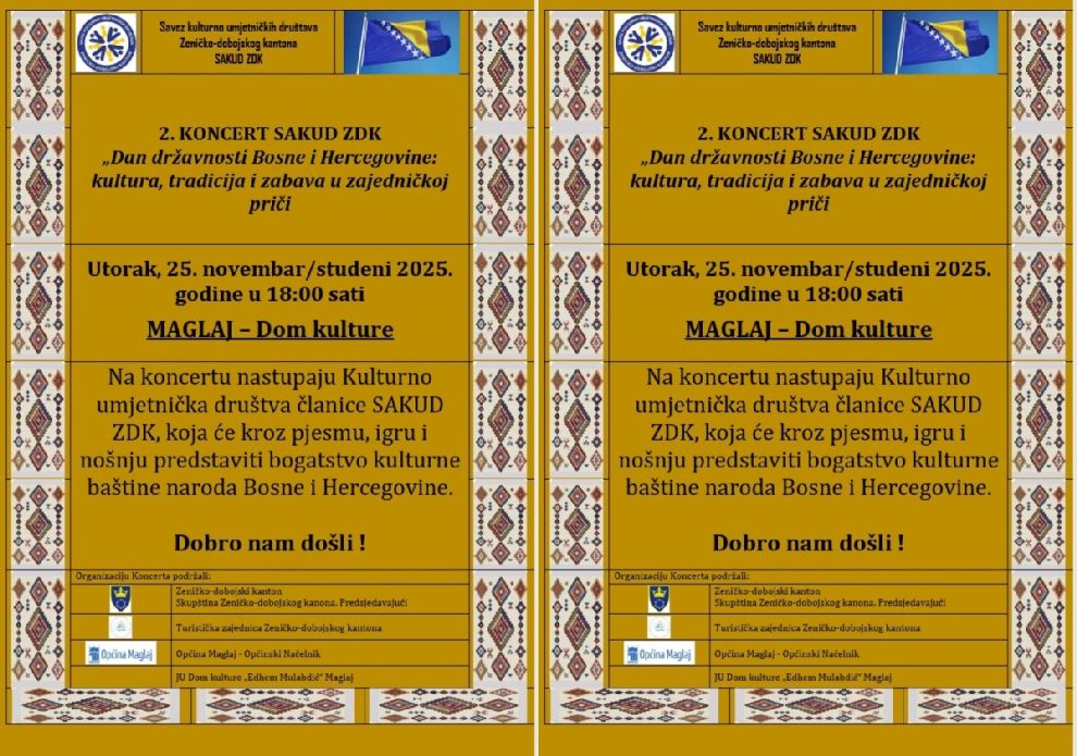 Savez kulturno-umjetničkih društava Zeničko-dobojskog kantona (SAKUD ZDK) organizira svečani koncert povodom 25. novembra/studenog – Dana državnosti Bosne i Hercegovine, koji će biti održan u utorak, 25. novembra/studenog 2025. godine u 18:00 sati u Domu kulture “Edhem Mulabdič” Maglaj.