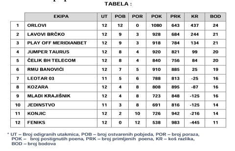 Tabela nakon nepotpunih 12 kola