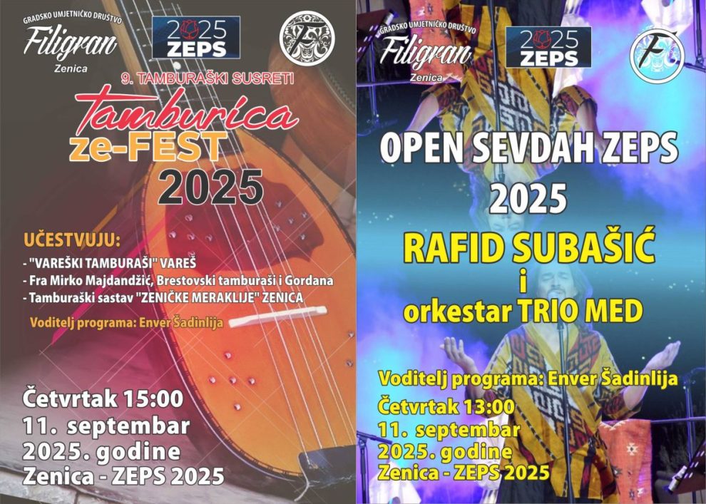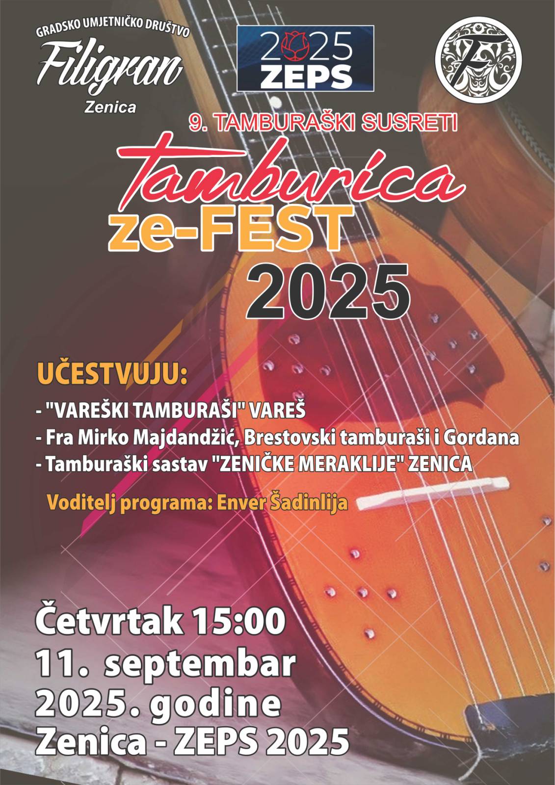 Druga manifestacija koju će organizovati GUD Filigran-Zenica na sajmu Zeps je 9. Tamburaški susreti-TAMBURICA ZE-FEST 2025 u kojem će učestvovati: “Vareški tamburaši”-Vareš, fra Mirko Majdandžić, “Brestovski tamburaši i Gordana”, i zenički tamburaški sastav “Zeničke meraklije” Zenica. Voditelj programa će takođe biti Enver Šadinlija.